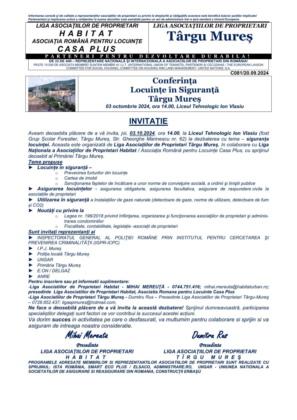 Avem deosebită plăcere de a vă invita, miercuri, 06.11.2024, ora 10.00, la hotel My Continental (fost Ibis Nord, Calea Griviței nr.143, sector 1, București, în proximitatea Gării de Nord), sala Enescu la o întâlnire utilă și relevantă, dedicată membrilor și reprezentanților asociațiilor de proprietari, organizată în colaborare de Liga Națională a Asociațiilor de Proprietari Habitat și avocat Gelu Pușcaș.